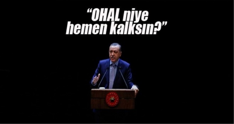 Cumhurbaşkanı Erdoğan,, 'OHAL kalksın diyorlar, OHAL niye hemen kalksın. Herşey yüzde yüz kontrol altında değil, cezaevinden dışarıya rahatlıkla tweet atanlar oluyor. Demek ki yeterli kontrol yok' dedi.
