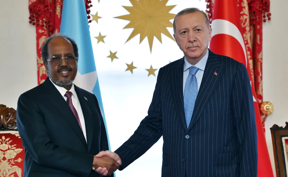 Somali Cumhurbaşkanı Hasan Şeyh Mahmud Dolmabahçe Çalışma Ofisi'nde Cumhurbaşkanı Erdoğan ile görüşürken;Dışişleri Bakanı Hakan Fidan da Somali Dışişleri Bakanı Abdüsselam Abdi Ali ile bir araya geldi.