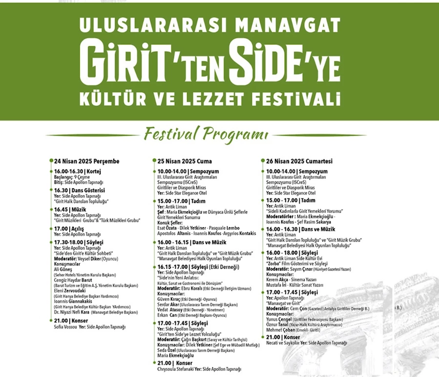 Uluslararası Manavgat Girit'ten Side'ye Kültür ve Lezzet Festivali, 24 Nisan günü saat 16.00'da, 9 Çeşme'den Apollon Tapınağı'na uzanacak kortej yürüyüşüyle başlayacak. Side Antik Liman'da gerçekleştirilecek tadım etkinliğinde Maria Ekmekçioğlu, Esat Özata, Dilek Yetkiner, Pasquale Lembo, Apostolos Altanis, Ioannis Koufos ve Argyrios Kontakis, Girit mutfağını bir sanat eserine dönüştürmek için yaygınlaşacak. Apollon Tapınağı'nda tatilde yemeklerin kültürel ve tarımla yetiştirilmesi ele alınacak. Festivalin finalinde ise Sideli kadınlar ve usta şefler, Girit'in gizemli mutfak sırlarını paylaşarak gastronomi geçmişiyle günümüze taşıyacak. Apollon Tapınağı'nın büyüleyici manzarası eşliğinde kurulacak dev sahnede üç gün boyunca ücretsiz halk konserleri düzenlenecek. Kutlamanın ilk akşamında Yunanistan'daki Eurovision Şarkı Yarışması'nda temsil eden ve “Platin Plak” ödülüne layık görülen dünyaca ünlü sanatçı Sofia Vossou, güçlü sesiyle sahne ödülü aldı.