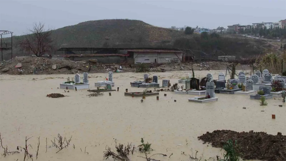 Sarıçam ilçesindeki Buruk Mezarlığı da sağanak sonrası sular altında kaldı. Bazı mezarların tamamen suya gömüldüğü anlar cep telefonu kamerasıyla kaydedildi.