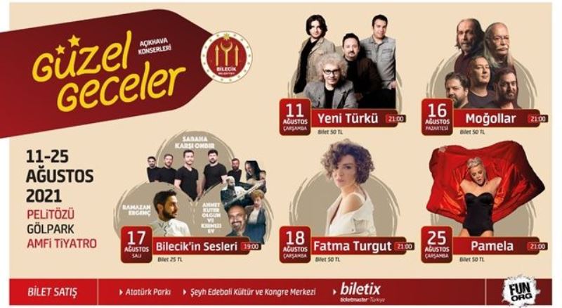 “Güzel Geceler” sloganıyla 11 Ağustos Çarşamba günü Yeni Türkü ile başlayacak konserler, 16 Ağustos Pazartesi günü Moğollar, 17 Ağustos Salı günü Bilecik’in Sesleri,18 Ağustos Çarşamba günü Fatma Turgut ve 25 Ağustos Çarşamba günü Pamela konseri ile son bulacak.