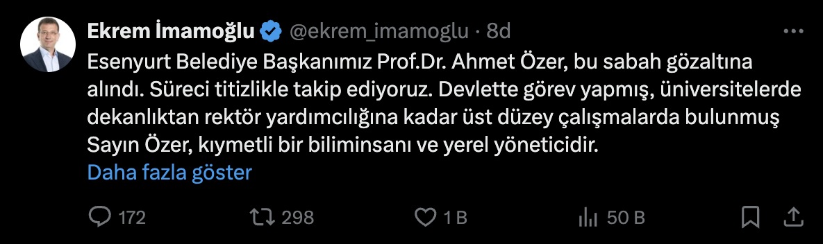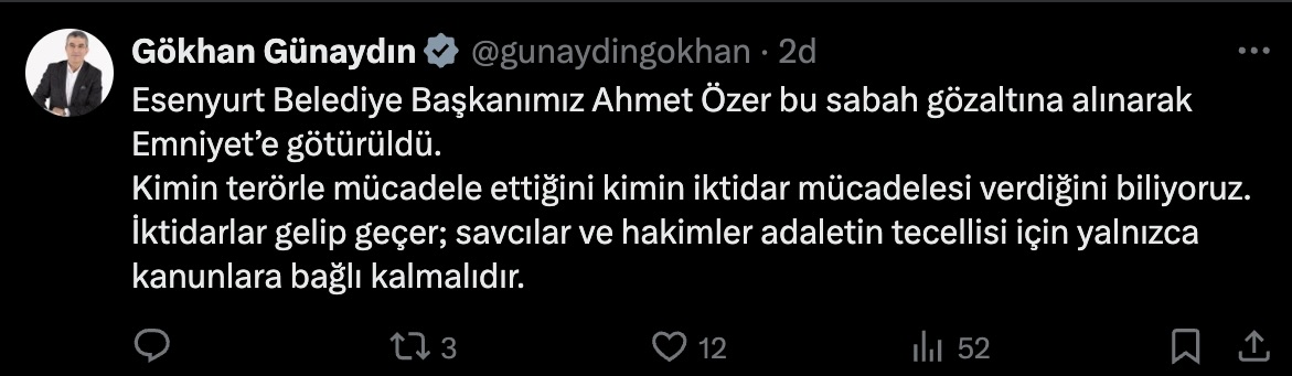 "Esenyurt Belediye Başkanımız Profesör Doktor Ahmet Özer, bu sabaha karşı yapılan operasyonda gözaltına alındı. Süreci yakından takip ediyorum.
