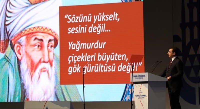 İstanbul’un sorunlarının yalnızca kendilerinin değil, merkezi idarenin de büyük oranda sorumluluğunda olduğunu vurgulayan İmamoğlu, “Biz, her alanda hükümetle iş birliği ve uyum içerisinde çalışmaya hazırız ve istekliyiz. Zihnimizde hiçbir soru işareti yok. Yalnız bizim tek bir şartımız var: Hiç kimse, ‘Ben bilirim, ben yaparım’ demesin. Hiç kimse, halka sesini yükseltmesin. Topraklarımızda bu sesler var zaten. Mevlana’yı dinlesin. Bakın ne demiş hazreti Mevlana: ‘Sözünü yükselt; sesini değil. Yağmurdur çiçekleri büyüten; gök gürültüsü değil’. Onun için; hepimiz, halkın, uzmanların ve bilim insanlarının sözlerine gönülden kulak verelim. Ortak aklı bulma ve hakim kılma konusunda istekli, candan ve samimi olalım. Bugünkü çalıştay, bu anlayışın ve çabanın bir ürünüdür. Bugünkü çalıştay, ortak akla ve ortak karara ulaşma çabasının bir ürünüdür. Bugünkü çalıştay, bu aziz şehrin, medeniyetlere beşiklik yapmış bu kadim coğrafyanın gelecek adına korunması çabasının bir ürünüdür. Bugünkü çalıştay, millete emretmek yerine, millete fikrini sorma çabasının bir ürünüdür” dedi.