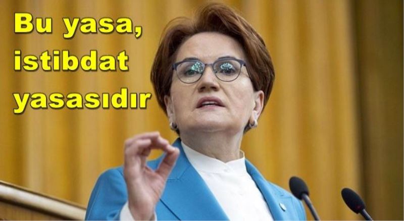 Akşener AKP ve MHP'nin sunduğu, kamuoyunda dezenformasyon yasası olarak anılan yasa teklifini de eleştirdi. 'Bu yasa, internet sitelerini hizaya çekme yasasıdır. Bu yasa, televizyon ve gazeteler üzerinde kurulan baskıyı, internete taşıma sevdasıdır. Bu yasa, yeni bir RTÜK oluşturma çabasıdır. Ez cümle bu yasa, bir istibdat yasasıdır!' diyen Akşener, 'Peki neden böyle bir yasaya gerek duydular biliyor musunuz? Çünkü korkuyorlar. Gerçeklerden korkuyorlar. Adaletten korkuyorlar. Milletin özgürce konuşmasından, herkesin doğruları öğrenmesinden korkuyorlar' ifadelerini kullandı.