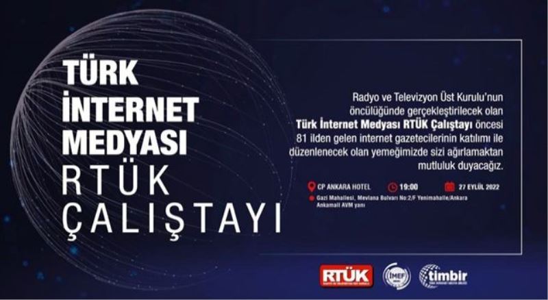 13 yıldır internet medyası ve bilişim alanında  önemli çalışmalara imza atan İnternet Medya ve Bilişim Federasyonu (İMEF) öncülüğünde, Türkiye’nin 81 il ile 7 ülkeden 900 internet gazetecisinin kurduğu Türk İnternet Medya Birliği (TİMBİR) ve   Radyo ve Televizyon Üst Kurulu ( RTÜK ) ile Türk İnternet Medyası Çalıştayı düzenleyecek.  Çalıştaya Türkiye’nin tüm illerinden ve Almanya, İngiltere, Gürcistan, Avusturya, Azerbaycan, İsviçre ve KKTC’den  çok sayıda basın mensubu katılacak.  Çalıştayın RTÜK uygulamaları ve internet medyası açısından önemli çıktılarının olması bekleniyor.