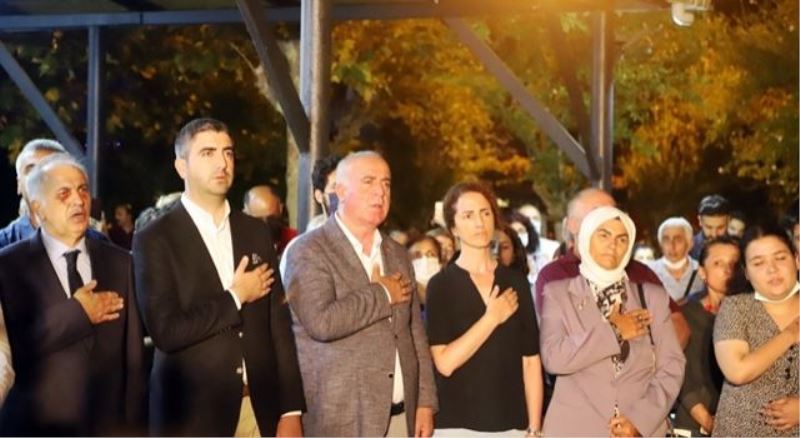 Yas-ı Muharrem Anması için Cemevi bahçesine kurulan sahnede önce Cemevi zakiri Can Şahin, Yas-ı Matem ve Muharrem Ayı’nın 10. günü nedeniyle mersiye ve deyişler seslendirdi.
