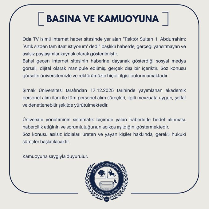 Şırnak Üniversitesi tarafından 17.12.2025 tarihinde yayımlanan akademik personel alım ilanı ile tüm personel alım süreçleri, ilgili mevzuata uygun, şeffaf ve denetlenebilir şekilde yürütülmektedir.