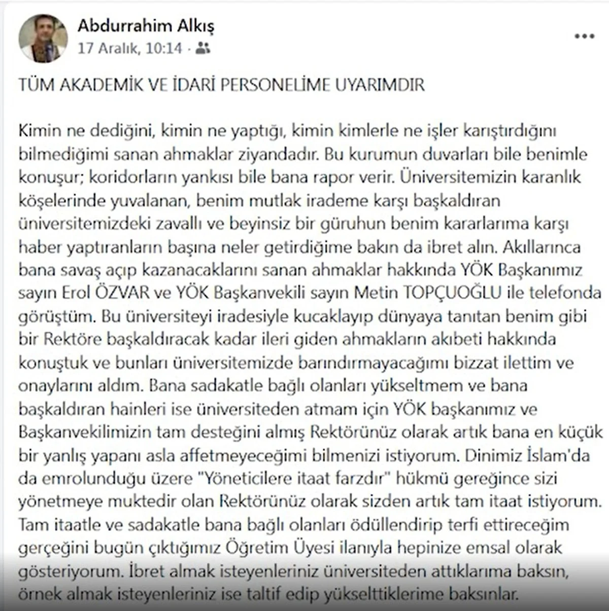 Rektör Alkış'ın kadro ataması paylaşımı hakkında açıklama