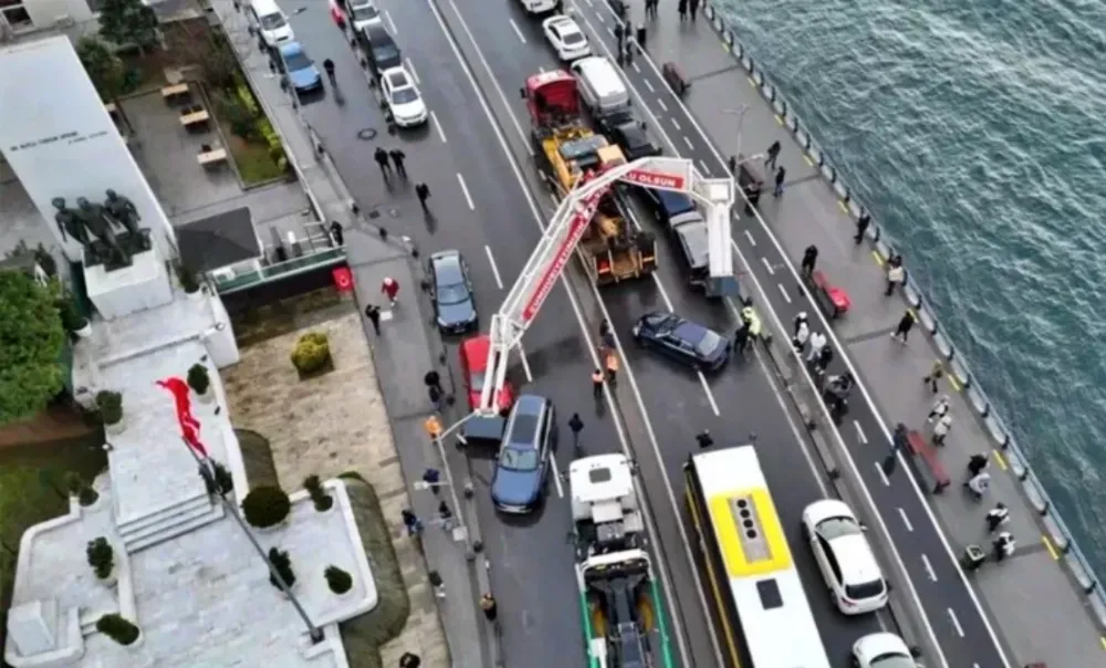 Üsküdar Sahil Yolu'nda, seyir halindeki bir TIR'ın dorsesinde bulunan ekskavatör, yol üzerindeki tabelaya takıldı. Çarpmanın etkisiyle devrilen tabela, çevrede park halinde bulunan araçların üzerine düştü.