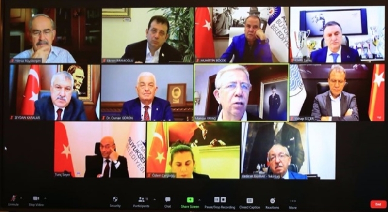Türkiye nüfusunun yaklaşık yüzde 50’sini barındıran CHP’li 11 Büyükşehir Belediye Başkanı, çevrimiçi toplantıda bir araya geldi. Her ay yaptıkları sanal toplantıyı yineleyen İstanbul Büyükşehir Belediye Başkanı Ekrem İmamoğlu, Ankara Büyükşehir Belediye Başkanı Mansur Yavaş, İzmir Büyükşehir Belediye Başkanı Tunç Soyer, Adana Büyükşehir Belediye Başkanı Zeydan Karalar, Antalya Büyükşehir Belediye Başkanı Muhittin Böcek, Aydın Büyükşehir Belediye Başkanı Özlem Çerçioğlu, Eskişehir Büyükşehir Belediye Başkanı Yılmaz Büyükerşen, Hatay Büyükşehir Belediye Başkanı Lütfü Savaş, Mersin Büyükşehir Belediye Başkanı Vahap Seçer, Muğla Büyükşehir Belediye Başkanı Osman Gürün ve Tekirdağ Büyükşehir Belediye Başkanı Kadir Albayrak, gündeme ilişkin yaşadıkları ulusal ve yerel sorunları masaya yatırdı. Başkanlar; pandemiden kazı ruhsatı verme izninin ilçe belediyelerine devrine, kuraklıktan toplumsal yoksulluk sorununa kadar birçok konuda görüşlerini paylaşıp, çözüm önerilerini sıraladı.