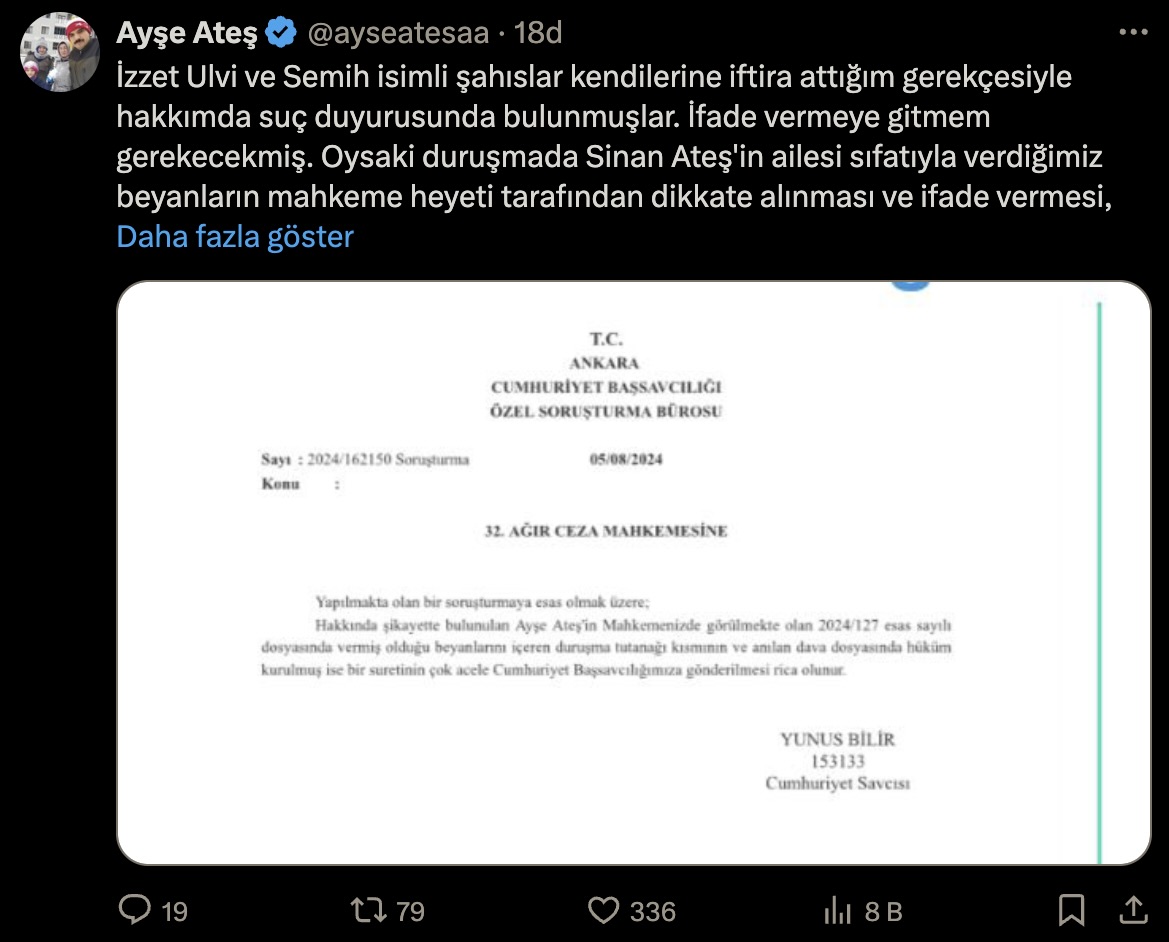 "İzzet Ulvi ve Semih isimli şahıslar kendilerine iftira attığım gerekçesiyle hakkımda suç duyurusunda bulunmuşlar. İfade vermeye gitmem gerekecekmiş. Oysaki duruşmada Sinan Ateş'in ailesi sıfatıyla verdiğimiz beyanların mahkeme heyeti tarafından dikkate alınması ve ifade vermesi, kendini aklaması gereken şahısların İzzet Ulvi ve Semih olması gerekiyordu. Demek ki onlarda sistem böyle...