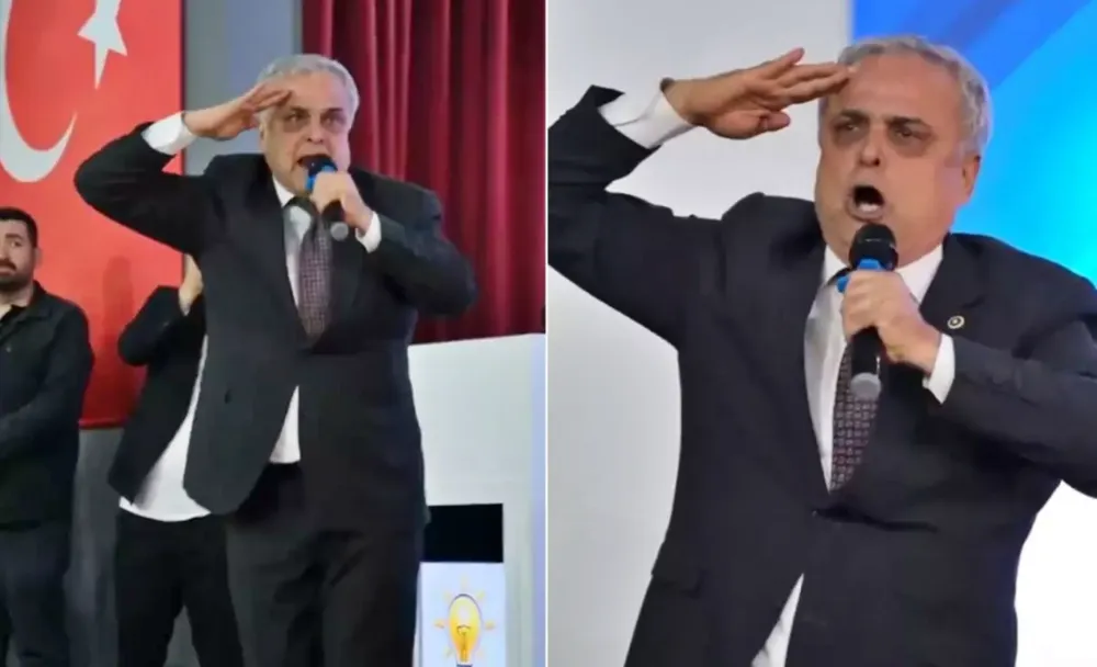 Bir kez daha Erdoğan'a övgülerde sınır tanımayan Çakır, salonda bulunan Erdoğan'ın fotoğrafına bakarak asker selamı verdi.