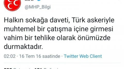 Hâlâ MHP’nin Twitter sayfasında duran mesajda, “Halkın sokağa daveti, Türk askeriyle muhtemel bir çatışma içine girmesi vahim bir tehlike olarak önümüzde durmaktadır” denildiği görülüyor.