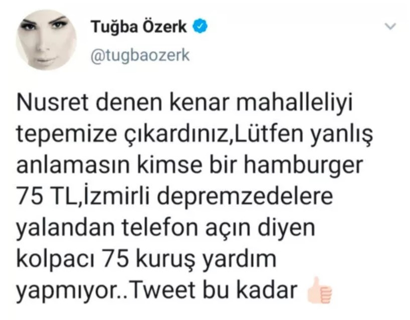 'Nusret denen kenar mahalleliyi tepemize çıkardınız. Lütfen, yanlış anlamasın kimse. Bir hamburger 75 TL... İzmirli depremzedelere yalandan 'Telefon açın' diyen kolpacı, 75 kuruş yardım yapmıyor. Tweet bu kadar...'
