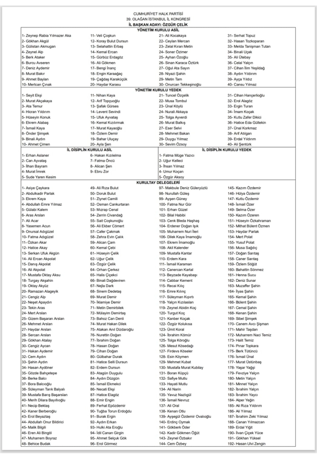 CHP 39. Olağan İstanbul İl Kongresi'nde, seçime tek aday olarak giren Özgür Çelik yeniden il başkanlığına seçildi. Bayrampaşa'daki İstanbul Büyükşehir Belediyesi (İBB) Hidayet Türkoğlu Spor Kompleksi'nde gerçekleştirilen kongrede, Divan Başkanlığını Grup Başkanvekili Gökhan Günaydın yaptı. İl yönetimi ve kurultay delegeleri listesi yaklaşık 6 saatlik görüşmenin ardından belirlendikten sonra delegeler, hazırlanan alanda oylarını kullandı.