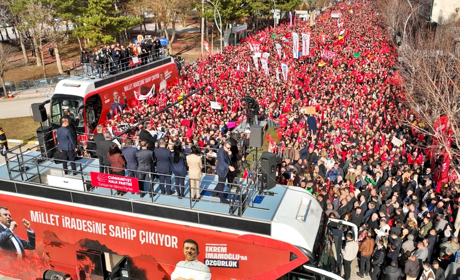 Bu yaşadıklarımızın hiçbiri durduk yere olmuyor. Diyorum ya bugün 86’ncı eyleme geldik. İlki Saraçhane’deydi. ‘Yarın ne olacak?’ dediler. ‘Yarın da buradayız’ dedik. İkinci gün bitti, ‘Sonuna kadar buradayız. Kayyım gidene, İBB kendi içinden başkan vekilini seçene kadar buradayız’ dedik. Yedi gün bitti, Maltepe’ye geçtik. ‘Bu nedir?’ dediler. Arefe günü 2,4 milyon toplandık, adımı Anadolu’ya attık. ‘Her hafta sonu başka bir ildeyiz’ dedik. O gün bugündür Mersin’den Van’a, Tekirdağ’dan Çorum’a kadar; Yozgat’tan Konya’ya, Kayseri’ye kadar ama CHP’nin ama AK Parti’nin güçlü olduğu yerlere gittik. ‘Gitme, orası AK Parti’nin kalesi’ dediler. Dedim ki ‘Artık kale siyaseti bitmiştir.’ Bugün de buradan, Çorum’dan haykırıyorum. Kale siyaseti bitmiştir. Çorum, ne AK Parti’nin ne başkasının kalesidir. Çorum, bundan sonra milletin kalesidir.