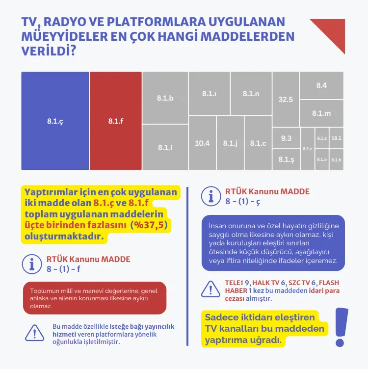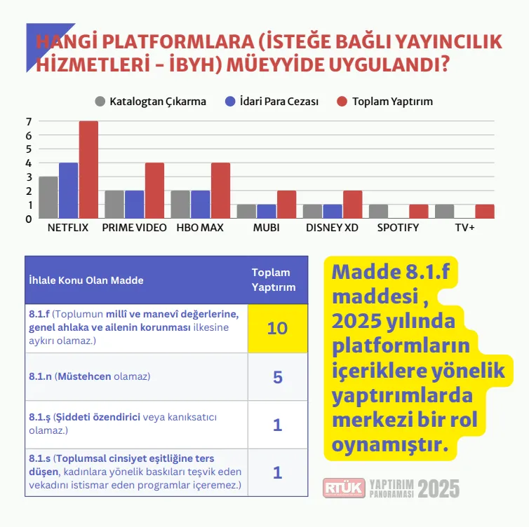 2025 yılı RTÜK uygulamalarına bakıldığında, 6112 sayılı Kanun’un 8. maddesi çerçevesinde verilen yaptırımların önemli bir bölümünün 8. maddenin birinci fıkrasının (f) bendi üzerinden verildiği görülmektedir. Bu bent; yayınların “toplumun millî ve manevî değerlerine, genel ahlaka ve ailenin korunması ilkesine aykırı olamayacağını” düzenlemektedir.