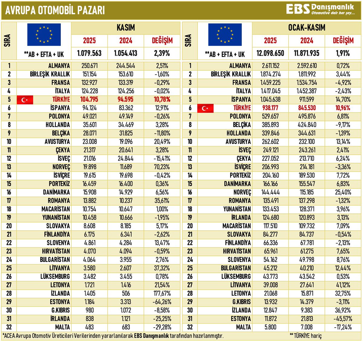 Kasım ayında Türkiye’de 104 bin 795 adet otomobil satışı gerçekleşti. Bu rakamla İspanya’yı bir kez daha geçen Türkiye, Avrupa otomotiv pazarında ilk 5 ülke arasına girdi. Aynı dönemde Avrupa genelinde otomobil pazarı yüzde 2,4 büyürken, Türkiye yüzde 10,8’lik artışla ortalamanın üzerinde bir performans sergiledi.