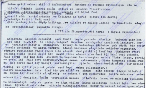 “İslam şairi Mehmet Akif 3 haftadan beri Antakya'da bulunup mütemadiyen din ve hilafet lehinde idarei kelâm ettiği ve oradaki firarilerden: