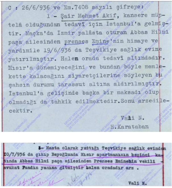 1 - Şair Mehmet Akif, kansere müptelâ olduğundan tedavî için İstanbul'a gelmiştir. Maçka'da İzmir palâsta oturan Abbas Hilmi paşa ailesinden Prenses Emin'nin himaye ve yardımile 19/6/936'da Teşvikiye sağlık evine yatırılmıştır. Halen orada tedavi altındadır. Mısır'a dönemiyeceğini ve bundan böyle memlekette kalacağını ziyaretçilerine söyleyen bu şahsın durumu tarassut altına aldırılmıştır. İstanbul'a gelişinde başka bir maksadı olup olmadığı da tahkik edilmektedir. Sonu arzedilecektir.