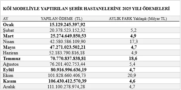 Bu son veri bizlere, gelir eşitsizliğinde payı olan KÖİ modelinin şehir hastaneleri kısmında, 2025 yılını toplu olarak değerlendirme olanağı da veriyor.